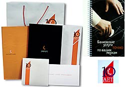 Специальная юбилейная открытка для рассылки клиентам банка демонстрирует высокий уровень культуры корпоративных бумаг, уважение к клиенту и персонально поблагодарит за сотрудничество и оказываемое доверие. Открытка нестандартного формата — квадратная. Это позволяет сразу выделить её из общей корреспонденции. Яркий факсимильный вкладыш создаёт ощущение личного обращения, которое своей рукой и в действительности написал сам председатель правления банка. Обложка по материалу и технике составляет пару обложке годового отчёта, а внутренний вкладыш — вкладышу приглашения. Круг замкнулся, комплект стал завершённым.