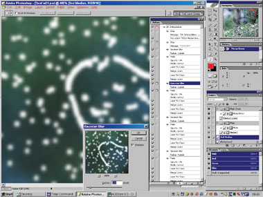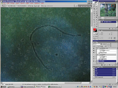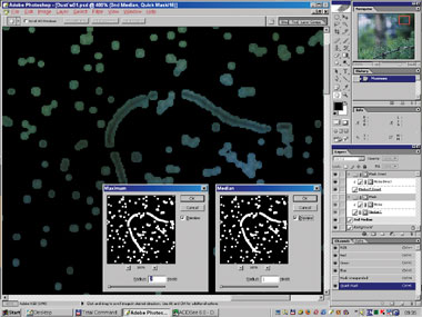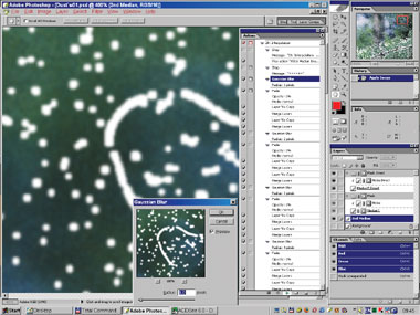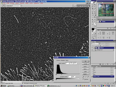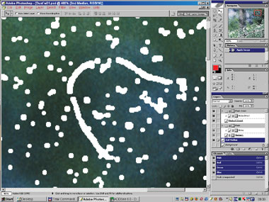 Снова продублируем оригинал. Назовём его «2nd Approach». Создадим выделение на основе заготовки нашей маски ( + щелчок по маске слоя со сглаженным изображением). Перейдём в режим Quick Mask, расширим и сгладим его (если не сделали это раньше). Вернёмся в режим Selection и вырежем через это выделение дырки в нашем новом слое (Edit Б─╒ Clear или ). Они должны полностью удалить не только сами дефекты, но и возможные ореолы вокруг больших диффузных дефектов (рис. 13б–14).