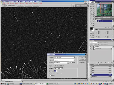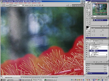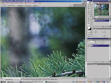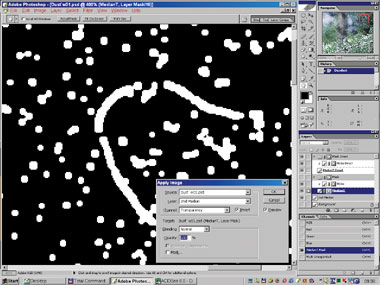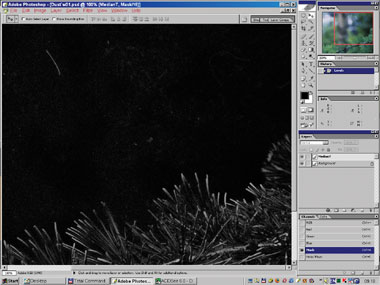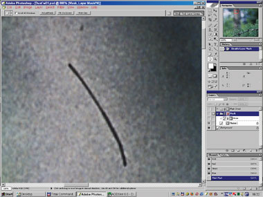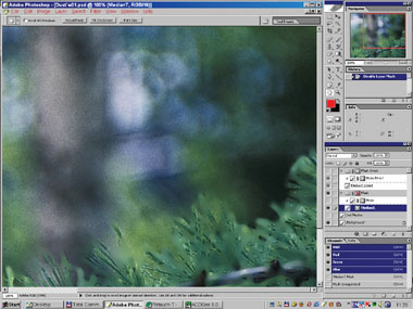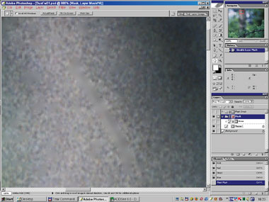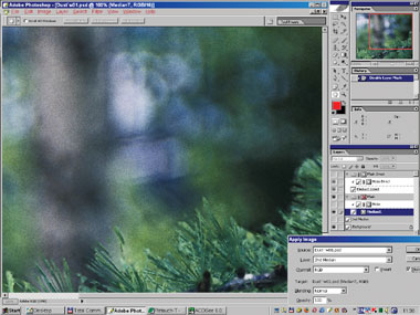 На рис. 24б–25 вы видите момент вставки интерполированного изображения вместо сглаженного медианой в самом начале. Маска слоя включена, поэтому различия видны лишь в областях автоматически созданной маски; на остальном пространстве просвечивает оригинал. Интерполяция деликатнее ведёт себя на границах сложных обюектов (хвоя). И хотя сама хвоя по-прежнему испорчена, к ней уже гораздо проще подступиться с помощью автоматической ретуши.