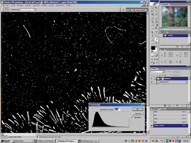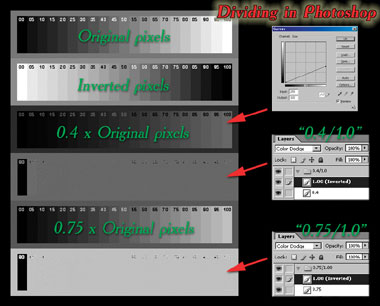 Теперь надо создать две своеобразные карты распределения шума: одна будет просто модуль отклонения яркости от среднего (медианного) значения, другая – усреднённой величиной модуля. Первую карту затем разделим на вторую (в Photoshop это возможно, см. рис. 3) и получим очень ровную картинку шума, применив к которой команду Threshold c нужным порогом, сразу по всему изображению получим маску для «отсечки» дефектов и самых больших выбросов зерна.