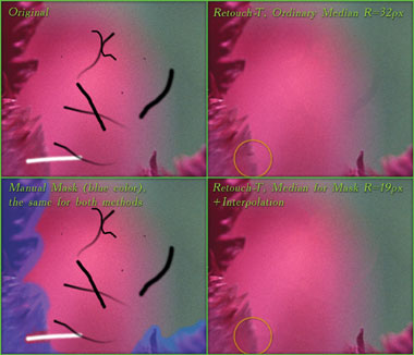 Рис. 31 демонстрирует «клинический» случай, который лучше позволяет сравнить обычное сглаживание медианой и метод с интерполяцией. Видно, что при обычном сглаживании требуется почти вдвое больший радиус, чтобы устранить дефект (машина работает медленно). К тому же дефект, пересекающий границу лепестка цветка, не удалось аккуратно убрать. На месте большого изюяна справа остался «дух». Метод с интерполяцией при меньшем радиусе медианного сглаживания (которое играет теперь лишь вспомогательную роль «проявителя» дефектов) значительно лучше справляется с задачей. Ручная маска в обоих случаях идентична.