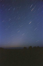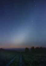 Мне захотелось снять Зодиакальный Свет (пылевое облако вокруг Солнца в виде гигантской линзы), используя неподвижно укреплённую на штативе камеру. Я сделал несколько кадров с разными выдержками, от 1 до 18 минут. На минутной хорошо получились звёзды, почти резкими. На больших выдержках – собственно явление, но звёзды, естественно, сильно смазались вследствие вращения Земли. Чтобы обюединить их, потребовалось аккуратно удалить звёздные треки с изображений. Тут я и воспользовался описанным методом. После работы Actions следы от звёздных ореолов ещё оставались – пришлось дополнительно сгладить изображение фильтром Median. В данном случае предварительная обработка значительно помогла улучшить качество конечной картинки. Звёзды затем были наложены в режиме Lighten, а сделанный чуть позже, на рассвете, кадр с хорошо проработанным ландшафтом монтировался через маску (рис. 32б–33). Обюектив Мир-20, F = 20 мм, f/4.8, плёнка 800 ISO.