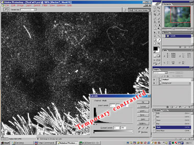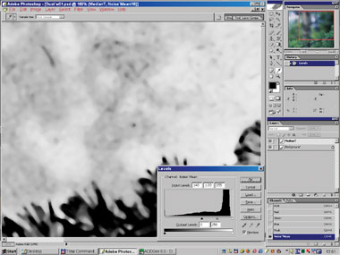 Теперь всё готово для маленького чуда, но пока пристальнее взглянем на то, что собираемся выравнивать. Временно контрастируем картинку в первом канале (следующей строчкой можно вставить команду Fade = 0%) и увидим крайне неприглядное зрелище (рис. 6). Ведь мы собираемся командой Threshold отделить самые большие выбросы шума, чтобы потом назвать их дефектами. Но при такой неравномерности получилось бы слишком много «дезертиров» либо «безвинно пострадавших».