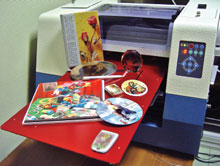 Причина «равнодушия» принтера к форме материала – в системе его подачи. Стол, на который укладывается предмет, перемещается под печатающей головкой и настраивается по высоте, благодаря этому толщина запечатываемого предмета может доходить до 10 см, а вес — до 20 кг (например, металлический лист толщиной чуть меньше 2 мм и макс. для прин-тера площади). Регулировка по высоте — вручную (кнопки «вверх» и «вниз» на панели управления) или автоматически: пара светодиод-фотодиод слева и справа от стола подачи определяет высоту запечатываемого предмета.