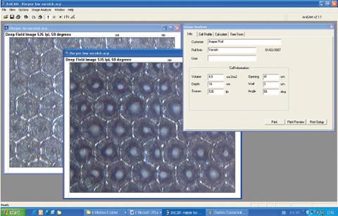 На копии экрана внизу показаны микрофотографии одного и того же анилоксового вала с чистыми ячейками и остатками лака. Без лака его объём 5,7 см3/м2 при глубине ячеек 18 микрон, а с остатками — 4,8 см3/м2 и 14 микрон. Потеря почти 1 см3/м2 диктует необходимость очистки вала, иначе при печати неизбежна потеря оптической плотности.