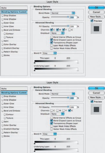 Условное наложение (Blend If: Yellow) для слоя CMY сделает сиреневый ещё чище — разъединяем белый треугольник на нижнем слое (Underlying Layer), щёлкнув на нём с нажатой клавишей Option (Alt). В тех областях, где на нижнем слое был сиреневый цвет (т. е. минимум жёлтого), верхний, шоколадный, слой отображаться не будет. Но это относится только к триадным каналам, а не к чёрному — он ведь не случайно остался на слое Black.