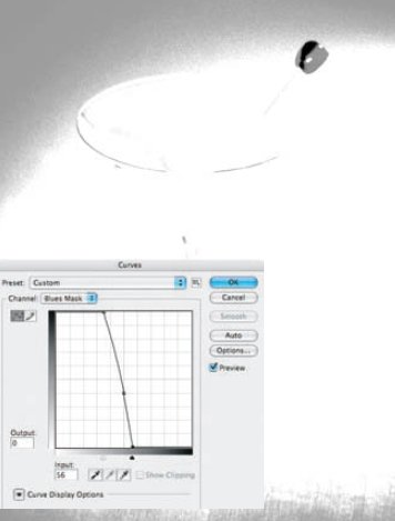 Копируем канал b, возвращаемся в основной файл, создаём маску для слоя Cyan & Yellow и вставляем в неё скопированный канал. При помощи кривых одновременно инвертируем маску (чтобы ручка была чёрной, а всё остальное — светлым) и резко поднимаем контраст.