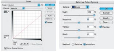 Корректируем общий цветовой тон фотографии — она должна быть синей, а не фиолетовой. Сначала добавляем Cyan в синие тона при помощи Selective Color, а потом в кривых немного снижаем плотность Magenta по всему фото.