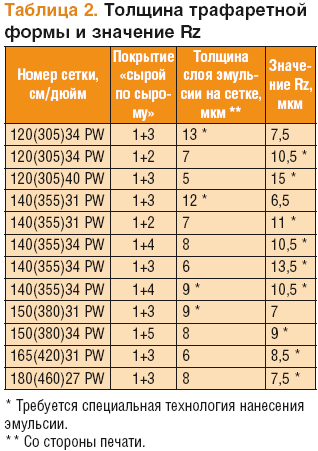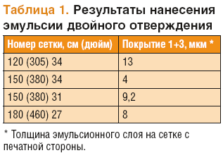 В табл. 1 приведены результаты нанесения однотипным способом на разные ткани стандартной эмульсии двойного отверждения. Обратите внимание: сетка с наименьшим процентом открытой поверхности имеет наименьшую толщину трафаретной формы. При использовании сетки с низким коэффициентом открытой поверхности нужно нанести один-два дополнительных слоя методом «сырой по сырому» с внутренней стороны трафарета или применить покрытие «сырой по сухому».
