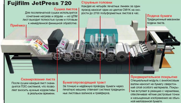 На выставке Graph Expo-2010 североамериканское подразделение Fujifilm впервые представило струйную листовую ЦПМ JetPress 720. Офсетный бумагопроводящий тракт машины, ориентированной на короткие тиражи, скомбинирован со струйными технологиями нанесения изображения.