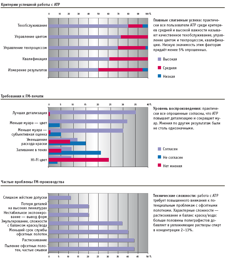 Группа WOCG попросила 35 пользователей АТР (77% рулонная печать с сушкой, 23% газетная) поделиться опытом и впечатлениями. Большинство опрошенных работают с АТР более двух лет, в основном используя альтернативные методики для выпуска публикаций, рекламных каталогов, справочников.