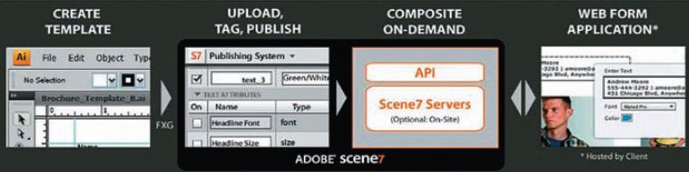 Среди множества решений для сегмента B2B выделяются серьёзные системы, одна из которых (хотя это кого-то и удивит) — Adobe Scene. Пакет имеет уже 7-ю версию и представляет собой полнофункциональный механизм управления всеми задачами, связанными с печатью переменных данных в самом широком смысле этого слова. Удобство, с точки зрения дизайна, – в «родной» поддержке линейки продуктов Creative Suite (InDesign, Illustrator, Photoshop) и наличии инструментария разработчика Accelerator SDK для создания собственных модулей автоматизации. Пакет ориентирован на типографии, готовые приложить существенные усилия к разработке собственного решения W2P. Желающим получить всё на блюдечке с голубой каёмочкой лучше обратить внимание на другие решения.