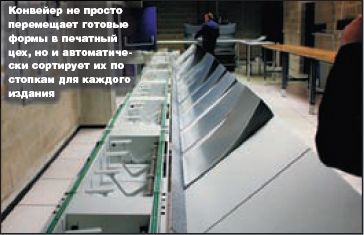 Допечатные процессы высокоавтоматизированные, при этом прагматичные французы используют две не самых современных термальных модели CTP Kodak Polychrome Newsetter TH180 CL, установленные в линию с проявками. Видимо, ранее они работали в другой типографии медиагруппы. Зато есть резервирование, а готовые формы поступают на конвейер Nela, в конце которого автоматически раскладываются по стопкам. В среднем за смену в типографии выводят около 1000 форм.