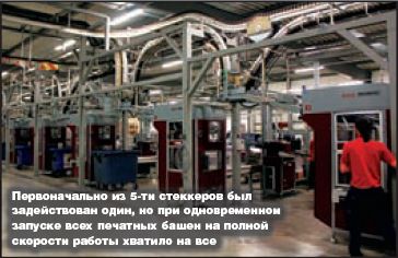 Здание проектировалось и строилось чуть раньше под другую машину, но было рассчитано на расширение мощностей. Поэтому при конфигурировании печатной машины остановились на необычном варианте расположения печатных башен и рулонных зарядок на одном уровне — под углом 90° к фальцаппарату. Конфигурация называется T90. Всё это позволило оптимально использовать площадь и даже сохранить перспективу для развития — справа и слева от линии башен осталось место для установки ещё двух.