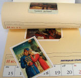 | Аудиторская фирма «Докар» выбрала для блока календаря-2004 обычную мелованную бумагу (170 г/м╡), посчитав, что это лучший вариант для фотоиллюстраций. Календарная сетка нанесена на узкую полоску из той же бумаги меньшей плотности (90 г/м╡). Мелованные листы разбавляют вставленные открытки из бумаги Dali (160 г/м╡), запечатанные офсетом с неожиданным иллюстративным рядом. Dali синего цвета (360 г/м╡) использовалась для изготовления обложки. Весь комплект (листы блока, ежемесячные вставки и открытки) сверху скреплён пружиной | Имиджевый календарь, разработанный по заказу казино «Метрополь», иллюстрирован фотографиями по мотивам произведений Пушкина. Консервативно, солидно и изысканно. Во многом - за счёт бумаги Mineral цветов Limestone и Quartz (оттенки коричневого), содержащей вкрапления по массе и имитирующей цвета природных минералов. Выигрышно смотрится печать на кальке GSK (160 г/м╡) |