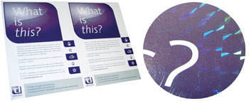 Отличие голографической фольги от обычной — микрорельеф на металлизированном слое. В зависимости от освещения или угла зрения можно увидеть разные объекты. Один из способов создания голографического рисунка — сложный процесс лазерной интерференционной съёмки, когда луч, проходя через систему разделителей и зеркал, изменяется благодаря феномену преломления (дифракции). Теме создания голограмм различных степеней защиты можно посвятить целую книгу, а мы ограничимся её применением в полиграфии.