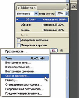 В меню программы появилась палитра «Эффекты» (Effects) — изменённая «Прозрачность» (Transparency), к которой добавлено управление прозрачностью контура, заливки и текста. Кнопка fx этой палитры открывает меню эффектов объекта. Пометив ячейку эффекта, вы включаете его с текущей настройкой. Чтобы изменить её, выберите строку с названием эффекта. Со временем вы придумаете много интересных вариантов; чтобы не терять находки, сохраняйте настройки в стиле объекта. Обратите внимание: теперь палитра стилей объекта пополнилась информацией о приложенных к объекту эффектах.