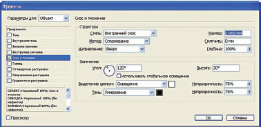 | Список эффектов появляется при щелчке по кнопке fx. Каждый имеет свои параметры, на снимке экрана — палитра эффекта «Скос и тиснение» (Bevel and Emboss) |
