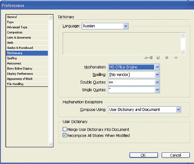 Для организации работы со средствами Microsoft откройте окно Configure Plug-ins, скопируйте (кнопка Duplicate…) набор All Plug-ins с новым названием Proximity otkl. Затем в строке Set: выберите этот набор и снимите галочку рядом с proximity.apln (рис. 2). После перезапуска программы названия языков, с которыми она работает, будут в скобках (Window│÷Type&Tables│÷Character Ctrl+T, меню Language). Это значит, программа помнит названия поддерживаемых языков, но не нашла модуля Proximity. Теперь надо для нужных языков вместо Proximity подключить модули Microsoft. Откроем окно Edit│÷Preferences│÷Dictionary, в меню Language выберем Russian, а в меню Hyphenation — MS Office Engine (рис. 3). Если предполагается работа с английским языком, в поле Language надо выбрать English: USA, только для этого варианта доступен инструмент MS Office Engine в поле Hyphenation.