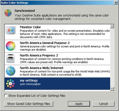 Командой EditБ─╒Creative Suite Color Settings можно быстро синхронизировать настройки CMS в основных программах Adobe Creative Suite. CMS в Adobe Acrobat не синхронизируется с остальными пакетами, стиль придётся выбрать в Preferences Acrobat.