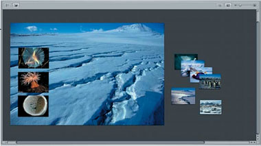 | Рис. 6. Собирать проект удобно на виртуальном световом столике, создавая из слайдов черновую версию, меняя масштаб и положение снимков, создавая макетные группы |