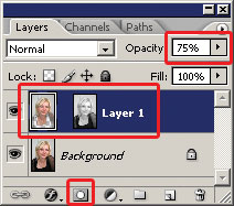 - Создаём слой-маску на основании имеющегося выделения Layer Б─╒ Add Layer Mask Б─╒ Reveal Selection или щелчком по кнопке внизу палитры Layers. В слое теперь существуют два обюекта: собственно слой и его растровая маска.