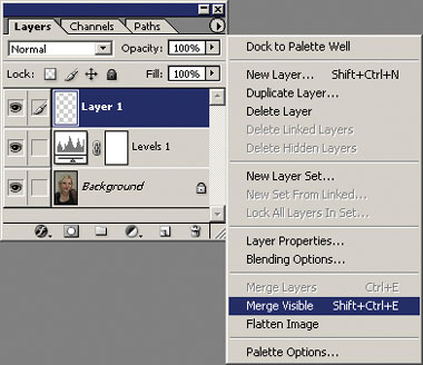 - Сводим в него видимые слои командой контекстного меню палитры Layers Merge Visible, удерживая (рис. 5). Это очень полезный приём, позволяющий, не выполняя полное сведение, получить образ текущего документа в виде единственного слоя. Применяем фильтр Filter Б─╒ Blur Б─╒ Gaussian Blur (для устранения неоднородностей подходят Filter Б─╒ Noise Б─╒ Dust&Scratches или Filter Б─╒ Blur Б─╒ Smart Blur). Во многих случаях предпочтительнее Dust&Scratches (Пыль и царапины), т. к. лучше сохраняет очертания лица.