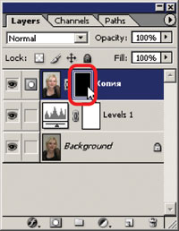 Поскольку теперь в строчке слоя находятся два обюекта (изображение и его маска), убедимся, что работаем именно в слой-маске. Если необходимо, переключаемся в неё щелчком по соответствующей миниатюре в палитре (рис. 8).