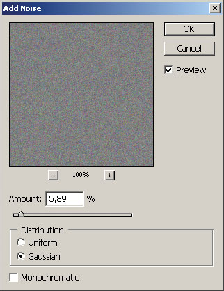 Рис. 11. Добавление цветного шума - Группируем слой с нижележащим размытым изображением, командой главного меню Layer Б─╒ Create Clipping Mask (рис. 12) или щелчком по разделительной линии между двумя слоями, удерживая .