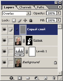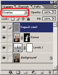 - Назначаем слою режим наложения Overlay - он затемняет изображение, если цвет темнее среднего значения, и осветляет в противном случае; если же цвет равен 50% серому, изображение не меняется (рис. 10).