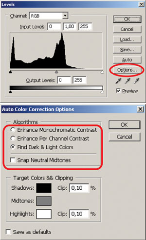 Рис. 3. Подбор алгоритма определения тонового диапазона - Можно выполнить лёгкое осветление движением среднего серого ползунка влево, хотя нашему изображению это не требуется.