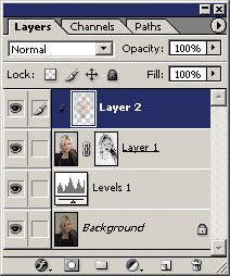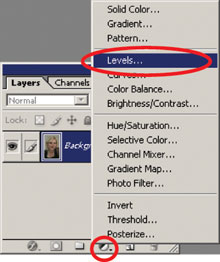 - Создаём корректирующий слой Levels командой главного меню Layer Б─╒ New Adjustment Layer Б─╒ Layers или через кнопку в нижней части палитры слоёв (см. рис. 2).