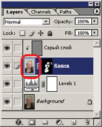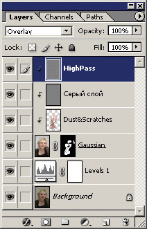Рис. 15. Новый слой сгруппирован - Применяем к нему сглаживающий фильтр. На этот раз воспользуемся фильтром Dust&Scratches, поскольку он лучше справляется со многими дефектами неоднородности, имеющими значительный радиус.