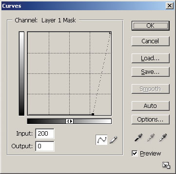 Рис. 23. Кривая для усиления контуров в маске - Загружаем выделение щелчком по композитному каналу RGB в палитре Channels, удерживая (рис. 22). Пиксели изображения выделяются пропорционально их светлоте.