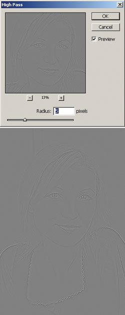 Рис. 19. Применение фильтра HighPass - Применяем фильтр HighPass для выделения высокочастотной составляющей. Радиус размытия возьмём 5 пикселей. Это позволит получить изображение, в котором содержатся фактурные элементы размером менее 5 пикселей (поры кожи).