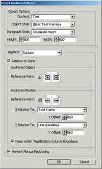Самый популярный «офисный пакет вёрстки» Word с лёгкостью размещает привязанные объекты не только в пространстве текста, но и на полях. В Publish № 1, 2005 рассказано, как это сделать в программе QuarkXPress. Теперь к ним подтянулся и InDesign… Управляйте параметрами привязки таких объектов в окне Anchored Object Options («Параметры привязанного объекта») Object -> Anchored Object -> Options (Объект -> Привязанный объект -> Параметры) (рис. 6). А теперь взгляните ещё раз на рис. 1 — чекбокс Import Inline Graphics определяет, будут ли импортироваться в InDesign из файла Word привязанные объекты.