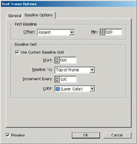 Старая идея использовать базовые линии для привязки текста замечательна — макеты получаются аккуратнее. К сожалению, пока от привязки мало проку, поскольку обычно есть одна общая сетка на всю публикацию. Теперь идея воплощена в новом качестве: каждый фрейм имеет свою сетку базовых линий. В окне параметров окна появилась закладка определения параметров базовых линий фрейма (рис. 3). Если в описании стиля есть привязка к базовым линиям, включите её, поставив галочку в ячейке Use Custom Baseline Grid («Использовать заказную сетку») параметров фрейма. При повороте фрейма вращается и сетка.