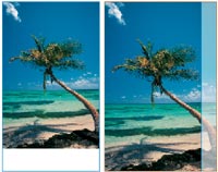 | Рис. 5. Заполнение фрейма. Рисунок размером 4,75Ё7,22 см помещён во фрейм 4x7 см. — внизу появилась белая полоса; — рисунок пропорционально увеличился и заполнил весь фрейм. Область картинки, вышедшая за пределы фрейма, полупрозрачная. Осталось только немного переместить рисунок в пределах фрейма. |