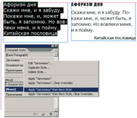 | Рис. 4. Применение цепочки стилей. В левом углу — исходный выделенный текст, справа он же после выполнения команды «Применить «Заголовок», затем следующий стиль». Впечатляет, не правда ли? |