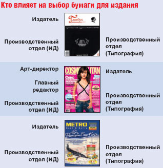 Круг лиц довольно узок (см. рис.). Если у арт-директоров и дизайнеров фантазия, как правило, простирается далеко за имеющийся бюджет, то у типографии всё строго. Ограничения диктует технология. Часто при запуске русскоязычного зарубежного проекта издатели в первую очередь обращают внимание на лицензию — выбор бумаги для оригинального журнала. Многие бумажные производители предоставляют услуги по изготовлению «кукол» — образцов использования бумаги для производства печатной продукции. В M-Real создан специальный Центр образцов (г. Киркниеми, Финляндия), откуда они доставляются за 2-4 рабочих дня. Среди оборудования листорезальная машина, аппараты для фальцовки, крепления обложки скрепками и на клей.