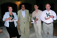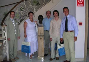Павел Левит («Берег»), Ольга Мордяшова («Медиа-Центр»), Александр Кубышкин (Смит энд Хартман) и Герман Абелев (дизайн-студия «Ветер») с менеджером по экспорту Fedrigoni Андреа Ферреро — у бюста основателя компании Джузеппе Антонио Федригони