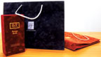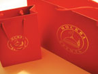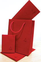 | Оба экземпляра выполнены из бумаги коллекции Flock, но смотрятся по-разному. Пакет, сделанный к презентации фильма «Турецкий гамбит», — символ царской роскоши и богатства, чему способствуют тиснение золотой фольгой и красный цвет. VIP-пакет Martini не менее роскошен, но блинтовое тиснение и чёрный цвет придали ему сдержанный, деловой характер |