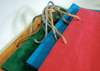 Гораздо интереснее популярные переплётные материалы, такие как «Эфалин» (торговая марка стала нарицательной, но есть и аналоги — «Имитлин», «Сурбалин», «Эвелин», Luxpack и др.). Переплётные материалы обладают всеми необходимыми свойствами: износо- и влагостойкостью, высокой прочностью на изгиб, надёжной склеиваемостью поверхностей. Из них получаются презентабельные, прочные, яркие, цветные пакеты с разными фактурами (самые распространённые — тиснения «лён» и «рогожка», если они не подходят — ищите нужную фактуру среди дизайнерских коллекций). Пакеты из переплётных материалов настолько прочны, что порвать их, ухватившись за дно и ручки, непросто. Другой очевидный плюс — невысокая стоимость при малом тираже: при заказе ста пакетов из эфалина один обойдётся в 2 долл., а из ламинированной мелованной бумаги — в 4 долл.: офсет при тираже 100 листов — дорогое удовольствие. Кроме того, переплётные материалы всегда есть на складах поставщиков, разве что под Новый год дефицит синего.