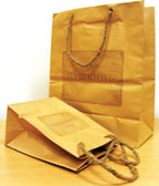 | Для «ретро»-пакетов помпезного кафе «Пушкин» была использована дизайнерская бумага «Гавана», запечатанная офсетом «под крафт». Композицию дополняют ручки из грубой бечёвки. Интересно, что эффект дала бы и непритязательная дешёвая крафт-бумага, но, заботясь об имидже и учитывая уровень посетителей ресторана, авторы посчитали необходимым «состарить» качественный материал |