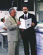 | Стив Джонсон (справа) вместе с совладельцем компании Copresco Чаком Легоретта проверяют цветной отпечаток, полученный цифровым способом. Кроме самой недавней инсталляции (DocuColor 2060), на производственной площадке компании в г. Кэрол Стрим работает еще пять систем DocuTech (три 6180 и две 135) |