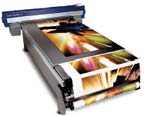 Широкоформатная струйная печать всё чаще интересует специалистов по шелкографии, осознающих выгоду цифровой техники при изготовлении небольших тиражей рекламной продукции. Gerber Scientific Pro-ducts (GSP) выпустила гибридный широкоформатный, печатающий УФ-чернилами принтер Solara ion (79 995 долл., 1600 мм, 1440 dpi, 57,5 м2/ч при двух проходах). По заявлению директора GSP по цифровым решениям Курта Брея, построенный на базе планшетного принтера аппарат оснащён мощной системой подачи рулонного материала, позволяющей осуществлять полноценную печать на текстильных материалах. Надёжная фиксация листового материала на вакуумном столе (до 25,4 мм) исключает проблемы с выравниванием. Среди особенностей — низкотемпературная технология УФ-отверждения Cold Fire Cure катионных чернил GerberCAT, отверждаемых при комнатной температуре. Итог — резкое расширение спектра запечатываемых материалов, в число которых вошли чувствительные к теплу пластики, винил, ткани, материалы на бумажной основе. Брей подчеркнул, что исключаются паузы между проходами печатающих головок, ранее требовавшиеся для охлаждения запечатываемого материала. Высокая адгезия чернил обеспечивает беспроблемную печать на стекле и тканях. Датчик толщины запечатываемого материала помогает автоматически фиксировать печатающие головки (две на цвет) и УФ-лампы на заданном расстоянии от него. Мощные системы размотки и намотки гарантируют безостановочную печать.
