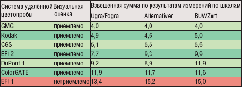 Практическая ценность тестов для нас — в применённой методике. Визуальная и колориметрическая (по Ugra/Fogra Medienkeil CMYK) оценки чётко коррелируют. Оценки по разным шкалам — тоже. Стоит прислушаться к рекомендации включить шкалу Ugra/Fogra или родственную в цветопробу. А отпечаток без такой шкалы — пробой не считать. Приведённые замеры только CMYK-плашек ни о чём не говорят. А вот полную шкалу можно замерить спектрофотометром и сравнить результат с опубликованными требованиями Ugra. Для этого у GMG, EFI, Kodak и др. есть специальный софт, но особо экономные (и наименее ленивые) могут по-