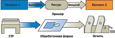 Каждый заказ описывается на основе подробно определённых процессов и ресурсов (рис. 2). Каждый процесс (традиционная печать или сканирование) — это набор входных и выходных «ресурсов», поскольку результаты работы одного процесса обычно являются входными ресурсами для другого. К ресурсам относят физические материалы (краски или пластины) и данные о заказе, включая инструкции по обработке и его параметры.