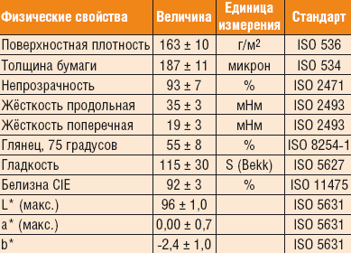 Третьим (кроме принтера и растрового процессора) важным компонентом является бумага — можно использовать материал от производителя принтера или разработчика (поставщика) растрового процессора. В ассортименте Lomond несколько типов бумаги для цветопробной печати, у которых цвет и степень глянца поверхности соответствуют требованиям FOGRA. Отличие этих материалов — высокая белизна при полном отсутствии в составе бумаги оптического отбеливателя. К сожалению, на сайте Lomond нет подробной информации об этих материалах — только список. В качестве примера приведём свойства одной из них: шелковисто-матовой бумаги плотностью 160 г/м2.