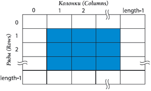 В зависимости от того, к какому объекту метод itemByRange() применён, получают диапазон строк (если применён для строк), столбцов или ячеек. Для обращения ко всем ячейкам из первой колонки, за исключением начальной (рис. 2, зелёные ячейки), можно написать: